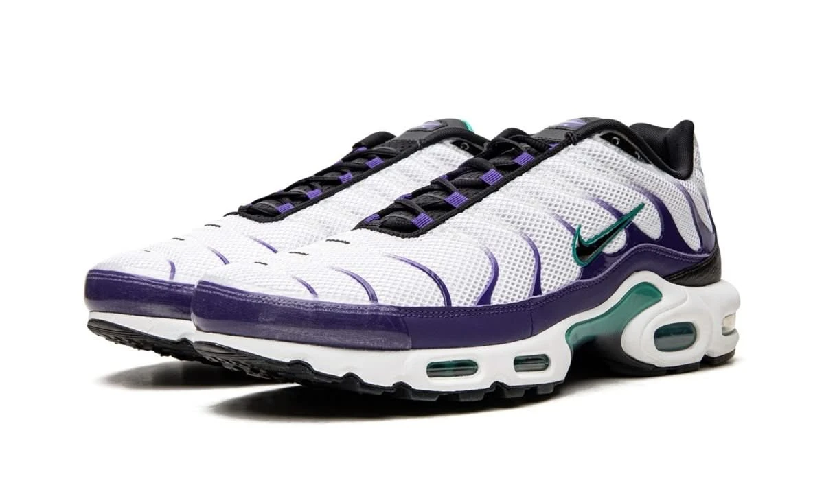 Nike Air Max Plus White Grape Ice est un chef-d’Ĺ“uvre mettant en vedette une tige en maille blanche accentuĂ©e par des lignes violettes fluides, se fondant Ă©lĂ©gamment vers le haut. Des touches de turquoise rehaussent l’unitĂ© Air, la semelle intermĂ©diaire, l’intĂ©rieur de la langue et les virgules latĂ©rales, crĂ©ant un contraste vibrant.